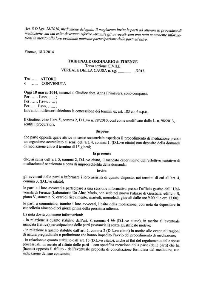 2) Invita le parti e i loro avvocati a partecipare ad un incontro informativo presso l’ufficio gestito dall’Università di Firenze (che è all’avanguardia in materia). In questo modo, il Tribunale compie una meritoria opera di diffusione della mediazione e di sensibilizzazione di cittadini e avvocati;