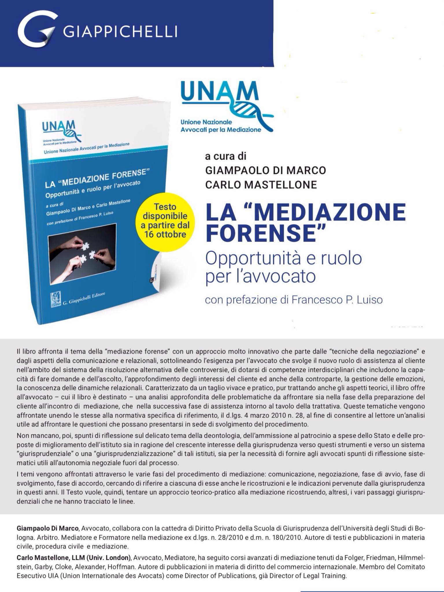 Il libro, edito da Giappichelli, è la prima pubblicazione curata da UNAM (Unione Nazionale Avvocati per la Mediazione, il cui sito è http://www.unam.it), associazione in forte crescita, presieduta da Angelo Santi e costituita da un largo di avvocati caratterizzati da un’ampia e matura visione del loro ruolo e del mondo giudiziario, e quindi aperti alle soluzioni alternative delle controversie e in particolare alla mediazione.